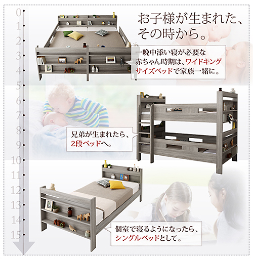 ワイドキングサイズ、2段ベッド、シングルベッド×2、3つのスタイルにモードチェンジすることができます。
